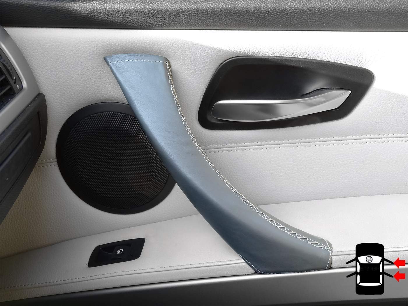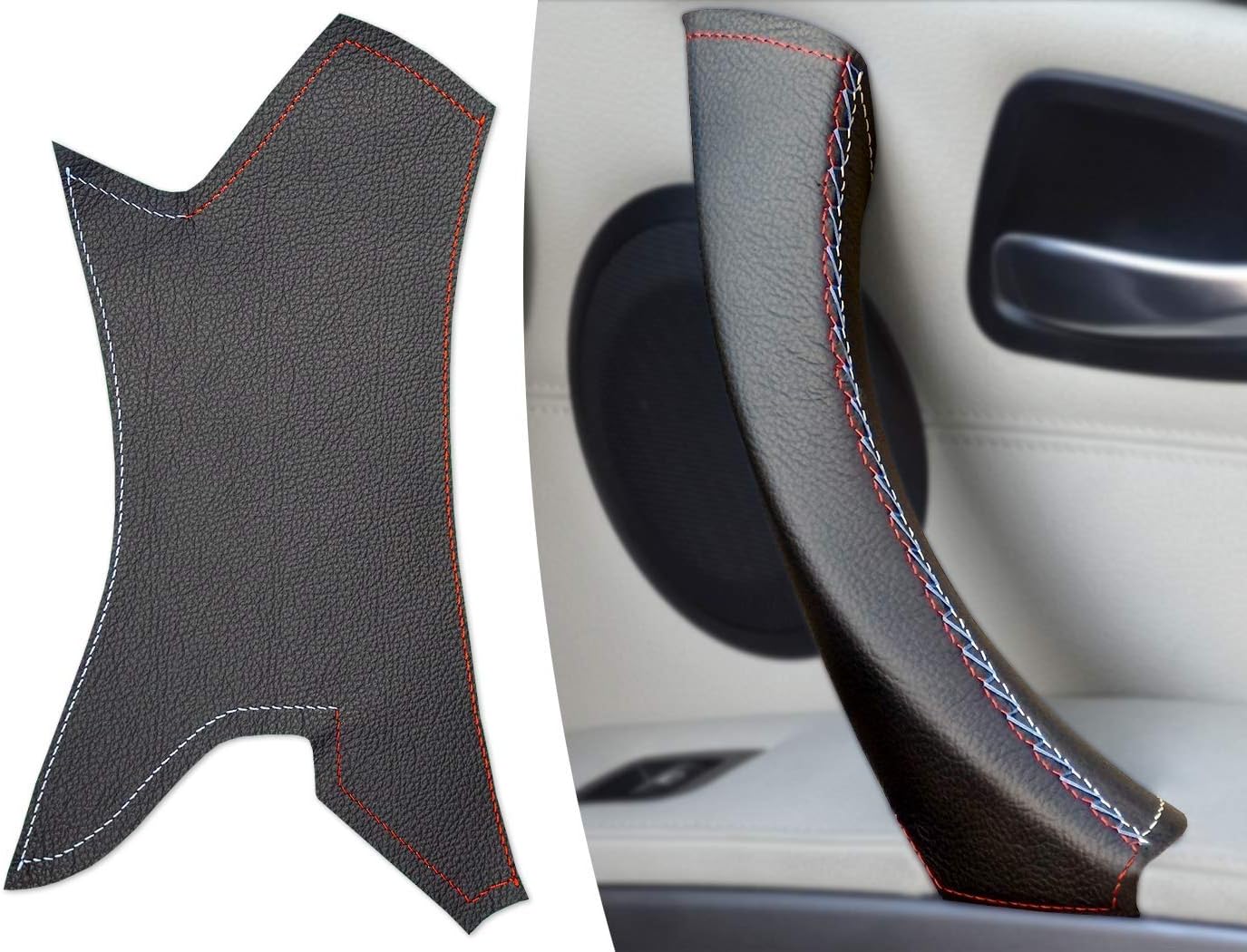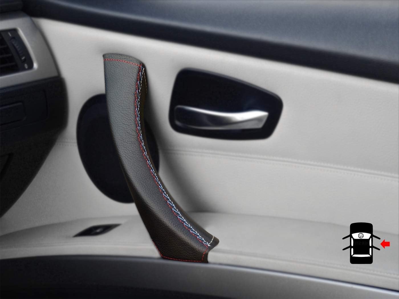 3 Series E90/ E91 Door Handle Cover - black leather, Right passenger door interior handle. Genuine black leather cover for the door handles for the 3 Series E90/ E91/ E92 & M3. High-quality 100% genuine leather door handle cover for installation on the existing door handle. Fit on the interior door handles of the 3 Series E90/ E91 (Fifth gen.) models 316d, 318d, 320d, 320i, 325d, 325i, 328i, 330d, 330i, 335d, 335i, 340d, 340i etc. Repair sticky 3 Series door handles with this black door handle cover for passenger door. Package includes: 1x Black door handle cover Needle and sewing thread Sticky tape Link to video instructionsRepair sticky interior door handles.