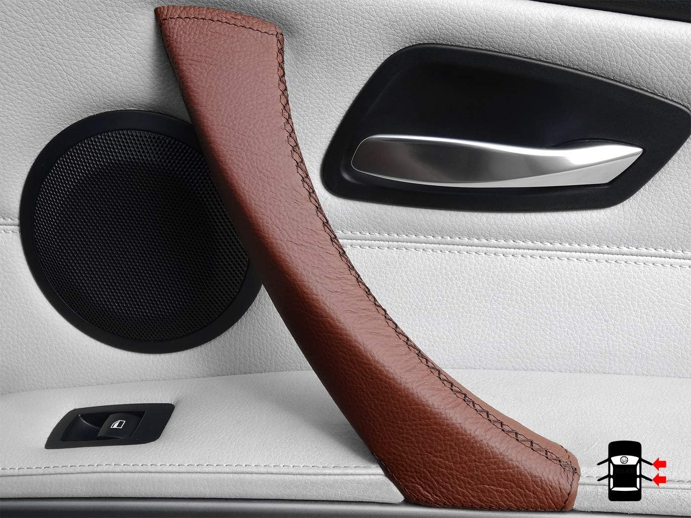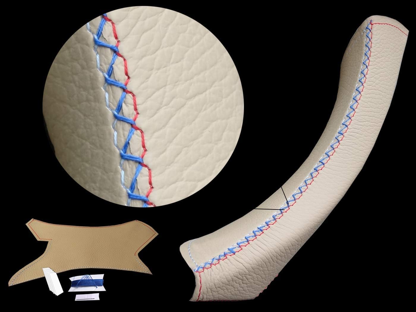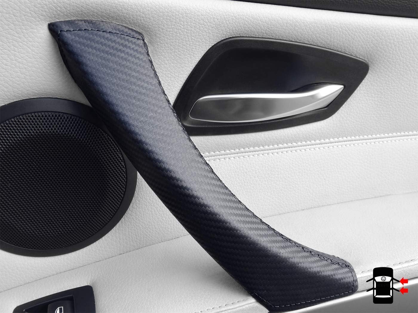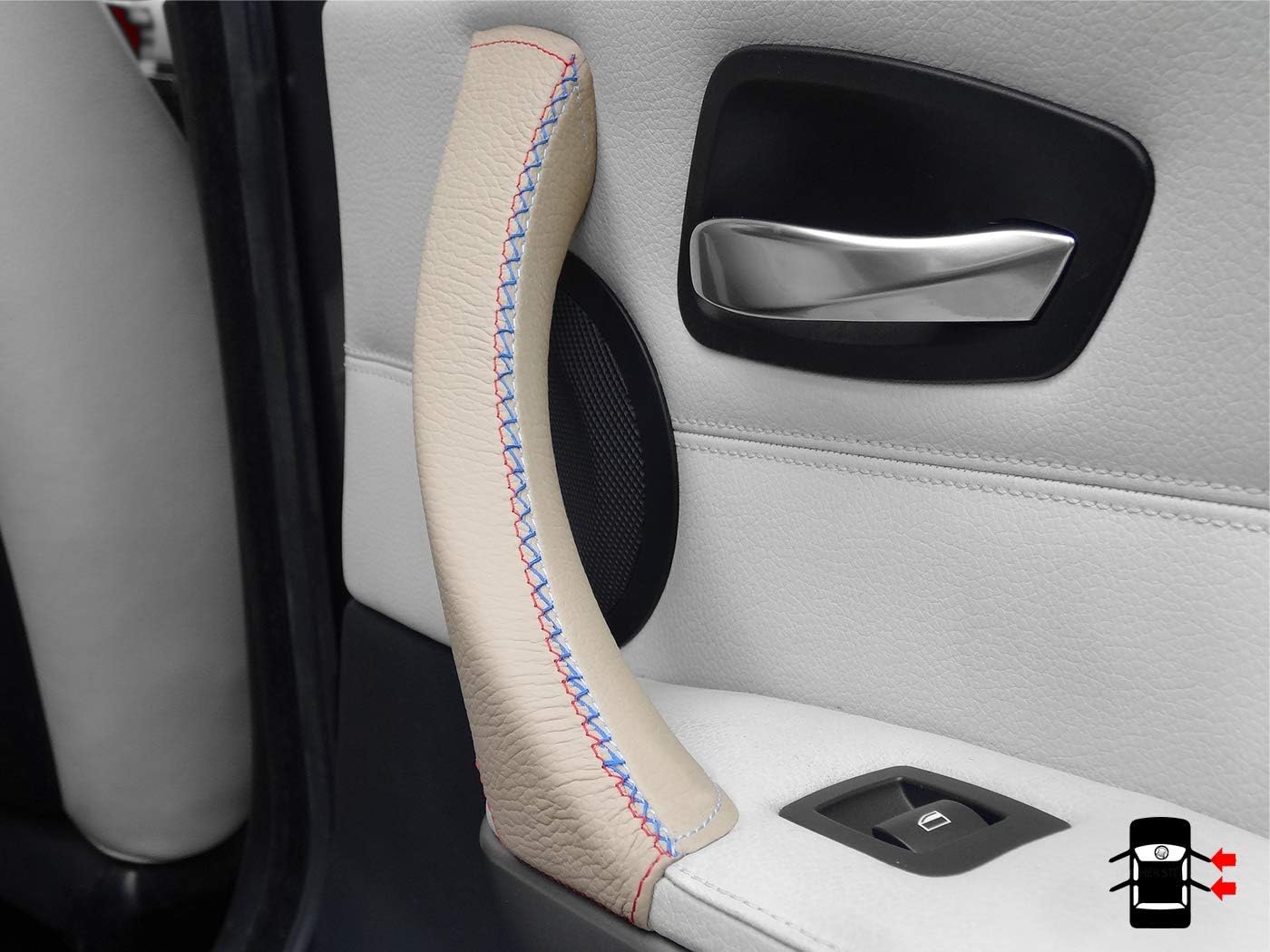 3 Series E90/ E91 Door Handle Cover - black leather, Right passenger door interior handle. Genuine black leather cover for the door handles for the 3 Series E90/ E91/ E92 & M3. High-quality 100% genuine leather door handle cover for installation on the existing door handle. Fit on the interior door handles of the 3 Series E90/ E91 (Fifth gen.) models 316d, 318d, 320d, 320i, 325d, 325i, 328i, 330d, 330i, 335d, 335i, 340d, 340i etc. Repair sticky 3 Series door handles with this black door handle cover for passenger door. Package includes: 1x Black door handle cover Needle and sewing thread Sticky tape Link to video instructionsRepair sticky interior door handles.