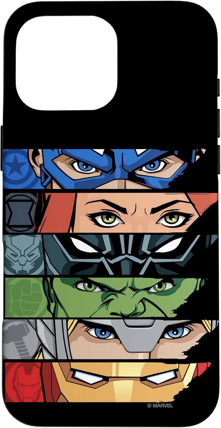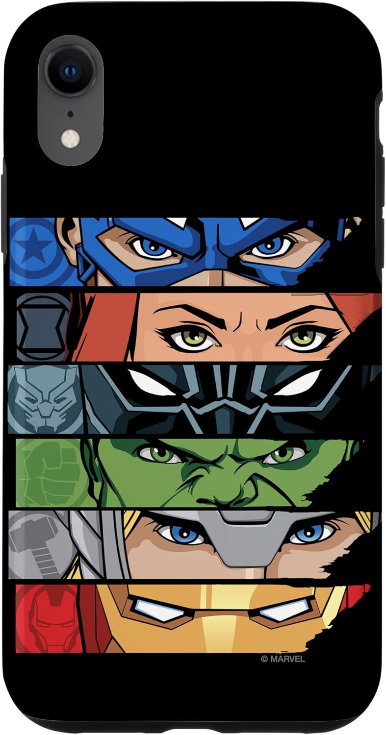 You may only be able to see their eyes, but it's clear who's on the front of this mighty Marvel phone case. The Avengers Assemble to save your device from the greatest threats of the universe. This protective phone cover features stacked images of Captain America, Black Widow, Black Panther, Hulk, Thor and Iron Man. This Marvel phone cover is available for the following iPhone and Samsung models: iPhone SE (2020), iPhone 7, iPhone 8, iPhone 11, iPhone 11 Pro, iPhone 11 Pro Max, iPhone X/XS, iPhone XS Max, iPhone XR, iPhone 7/8, iPhone 7 Plus/8 Plus, Galaxy S10, Galaxy S10+, Galaxy S10e, Galaxy S9, Galaxy S9+, Galaxy S8, Galaxy S8+.